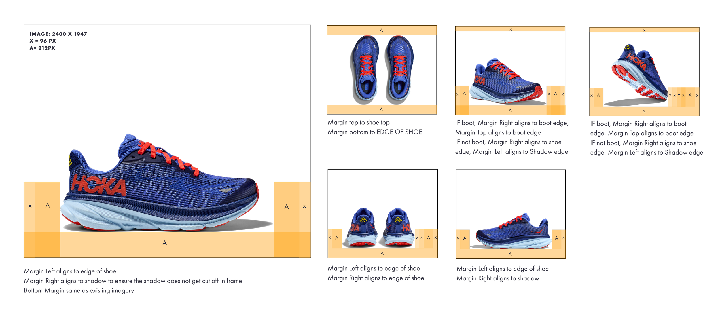 HOKA had photo guidelines for adult shoes but nothing for kids. I measured every margin, alignment, and negative space rule from the existing adult product photography, then created a kids-specific guideline from scratch to ensure consistency across the entire product catalog. Every angle (side, top, bottom, boot, non-boot) has specific margin and alignment rules documented with exact pixel values.
