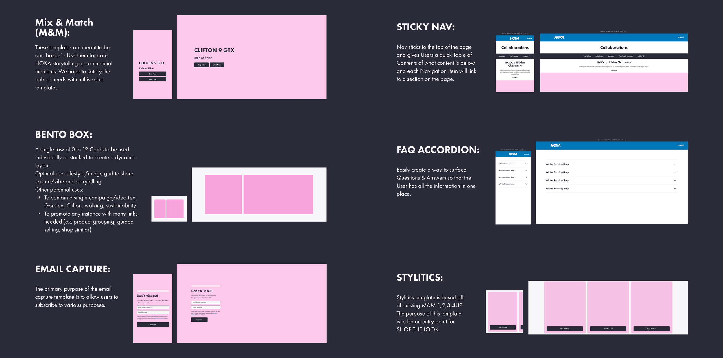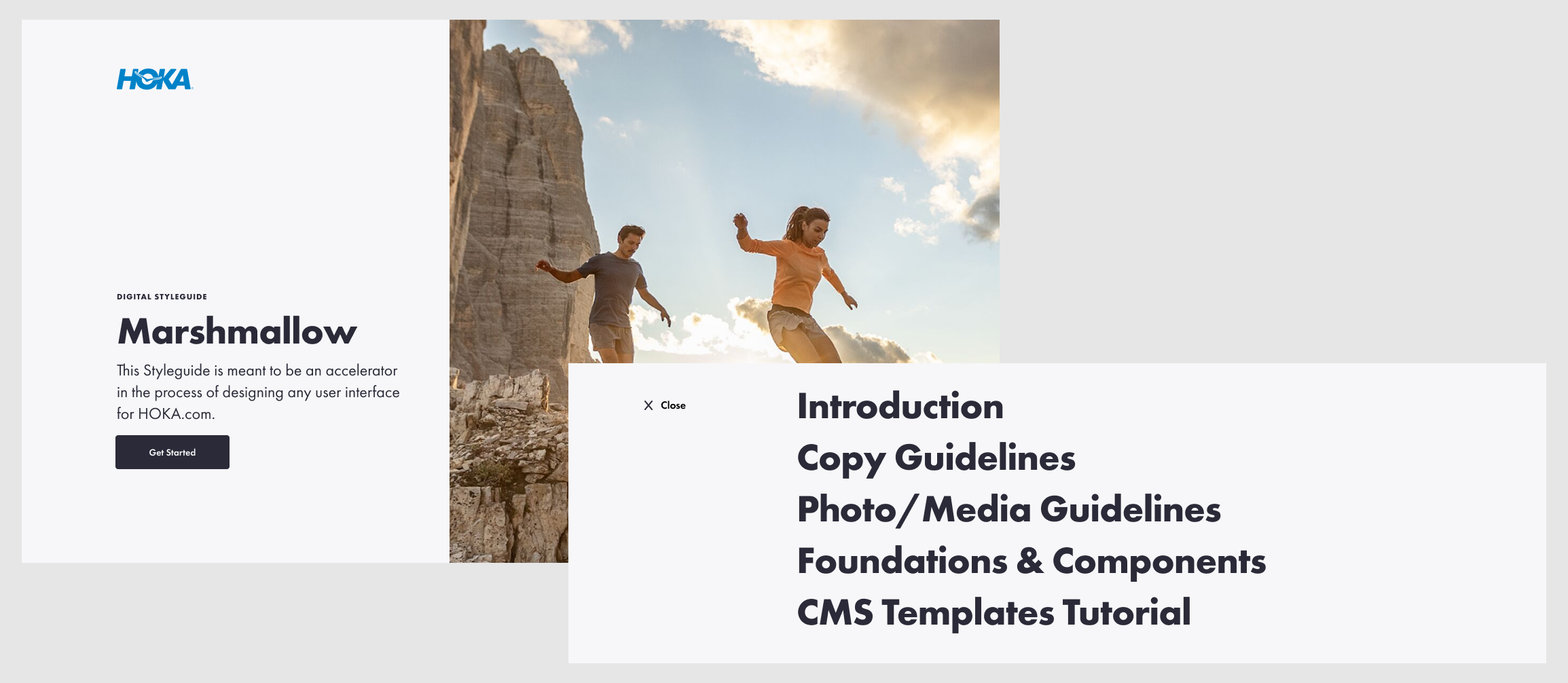 The scattered style guide HOKA had when I started was called Marshmallow. By the time I was done, Marshmallow was a fully governed, browsable system covering seven sections: Introduction, Copy Guidelines, Photo/Media Guidelines, Foundations and Components, CMS Templates, and Tutorials.
