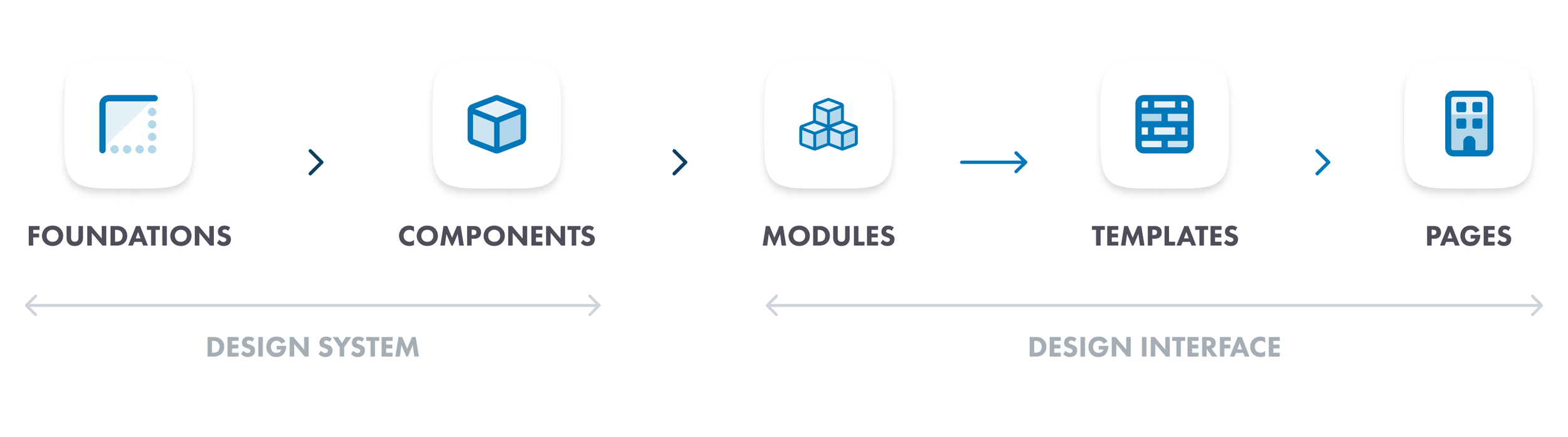 Foundations feed into components, components feed into modules, modules feed into templates, and templates assemble into pages. Every layer has clear rules so the system scales without breaking.